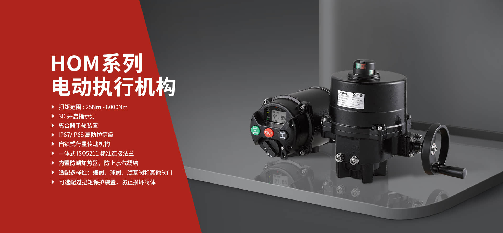 HOM系列帶行星齒輪的部分回轉(zhuǎn)電動(dòng)執(zhí)行機(jī)構(gòu),用于機(jī)械傳動(dòng)。輸出扭矩為25~8000NM,無(wú)離合器手動(dòng)操作。手動(dòng)和電動(dòng)分別操作。它在沒(méi)有手柄或離合器的情況下很容易操作,當(dāng)電源打開(kāi)時(shí),你可以轉(zhuǎn)動(dòng)手輪。電動(dòng)執(zhí)行機(jī)構(gòu)可與蝶閥、球閥、旋塞閥組合,廣泛應(yīng)用于發(fā)電廠/冶金廠/污水處理廠/樓宇自動(dòng)化/城市管網(wǎng)等管道系統(tǒng)